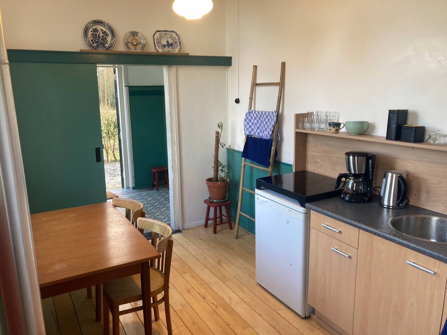 Bij binnenkomst in de hal van de kerk, kom je links in de gezellige woon- en slaapkamer met bank, eettafel, zithoekje, en twee tweepersoonsbedden. Deze ruimte biedt plaats aan vier gasten. De hal leidt verder naar een keuken met koelkast en kookfaciliteiten. Achter de keuken is de badkamer met douche en toilet. Bij mooi weer is het heerlijk vertoeven in de ruime achtertuin. Hier is ook een tafel en stoelen voor 4 personen. Deze tuin hoeft u niet te delen, maar grenst wel aan die van de gastheer. Deze plek is ideaal voor mensen die een eenvoudige maar sfeervolle locatie in een rustige omgeving zoeken.